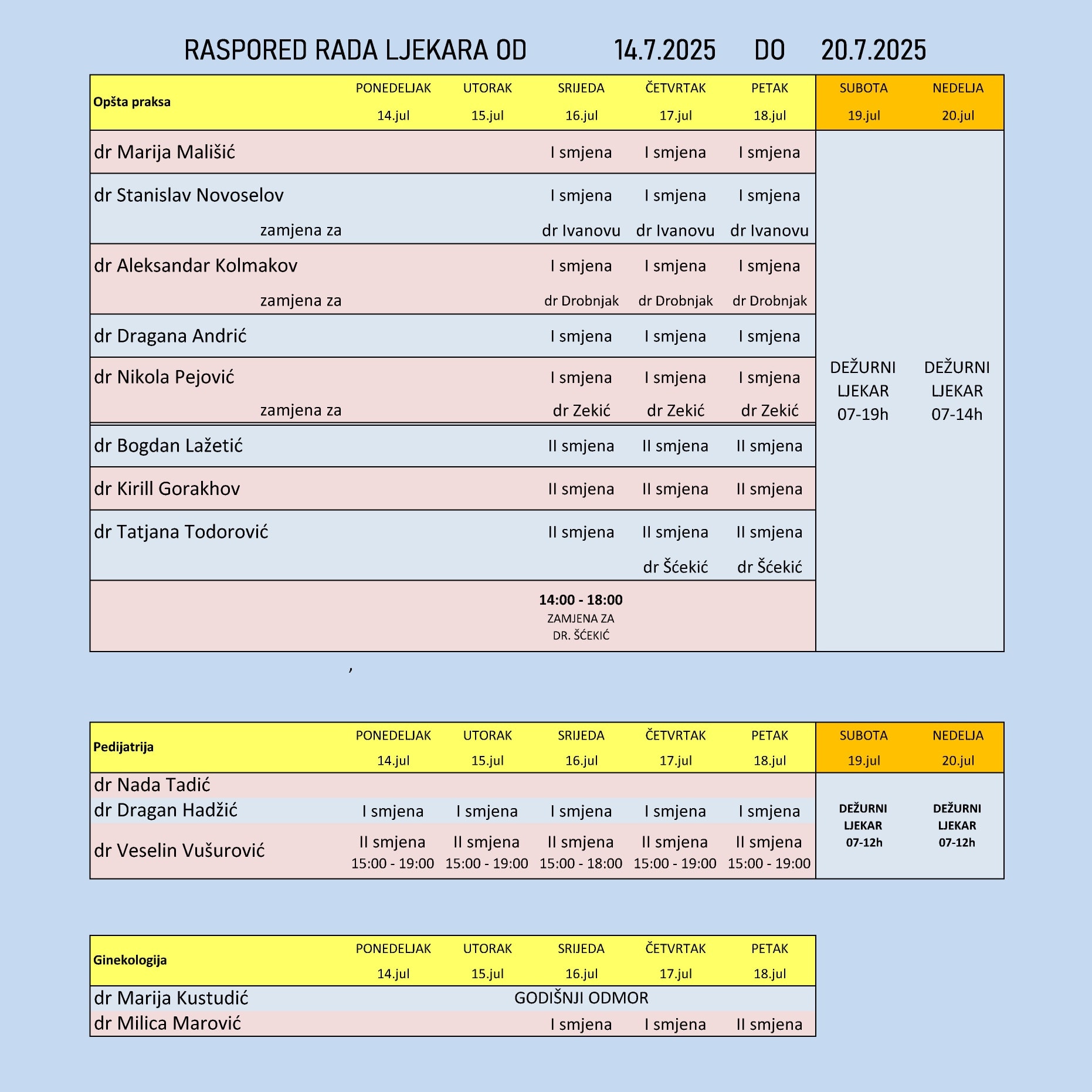 Raspored rada ljekara 14.07.2025 do 20.07.2025