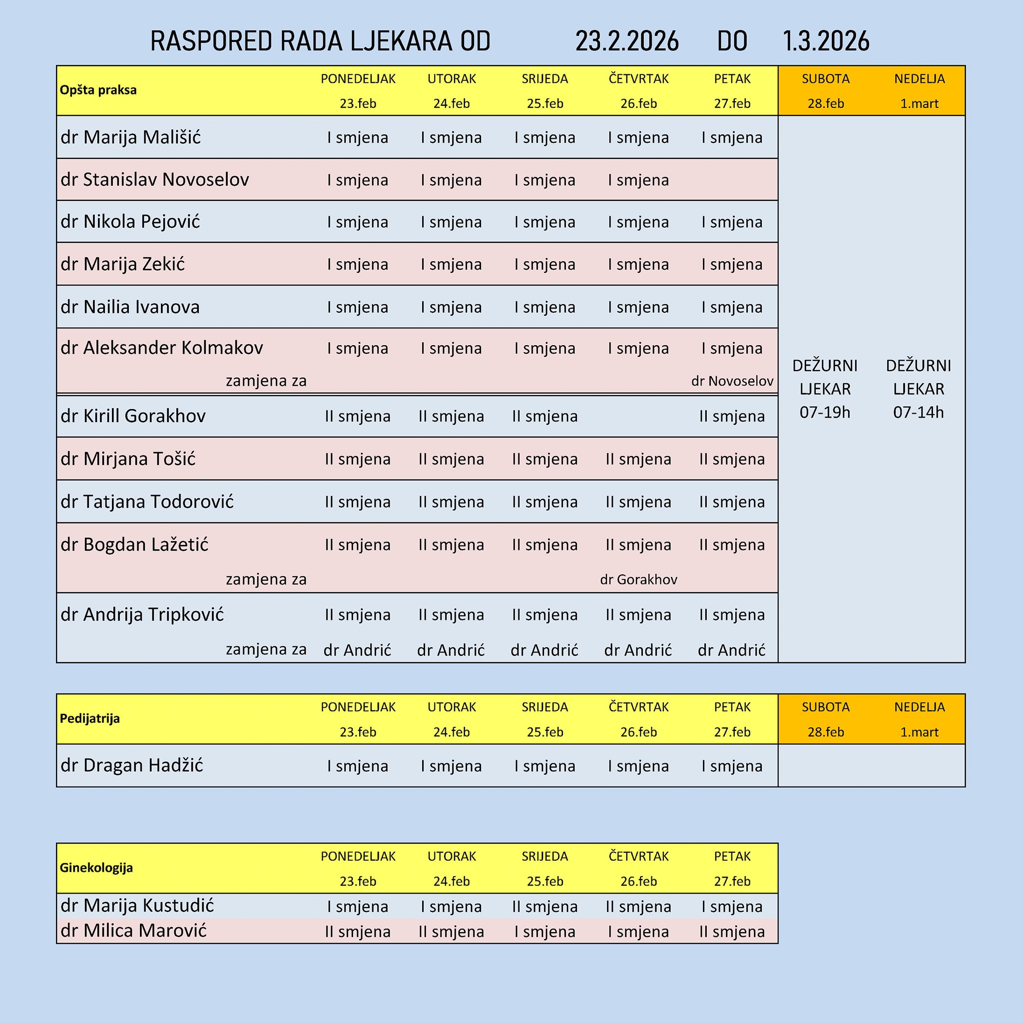 Raspored rada ljekara 23.02.2026 do 01.03.2026